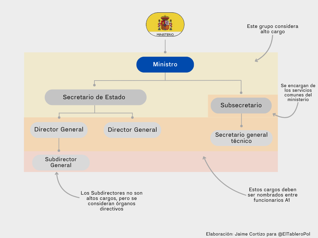 En el caso de España, en el Estado existen una serie de cargos muy importantes denominados altos cargos, que incluye a un amplio número de puestos. Aquí se incluyen los más conocidos como los Ministros o los Secretarios de Estado, pero también Presidentes y Directores de organismos públicos. Aunque dentro de este grupo existe un conjunto que deben de ser nombrados sí o sí entre altos funcionarios (grupo A1) como Directores Generales, también son nombrados directa o indirectamente por responsables políticos.