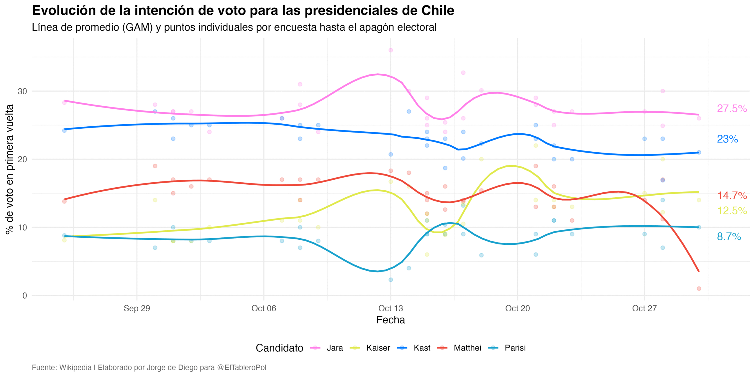 Una vez más, las encuestas indican que Jara llegará al balotaje. Frente a ella estará posiblemente José Antonio Kast, quizá Kaiser o incluso Matthei si al final de la campaña ha conseguido revertir la tendencia de las últimas semanas.